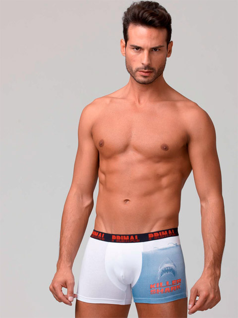 Мужские трусы-боксеры из хлопка с эластаном, на поясе широкая резинка с надписью "Primal", принт с акулой "Killer Shark".