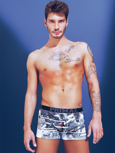 Мужские трусы-боксеры из хлопка с эластаном, на поясе широкая резинка с надписью "Primal", фронтальный принт "бокс", сзади меланжевые.