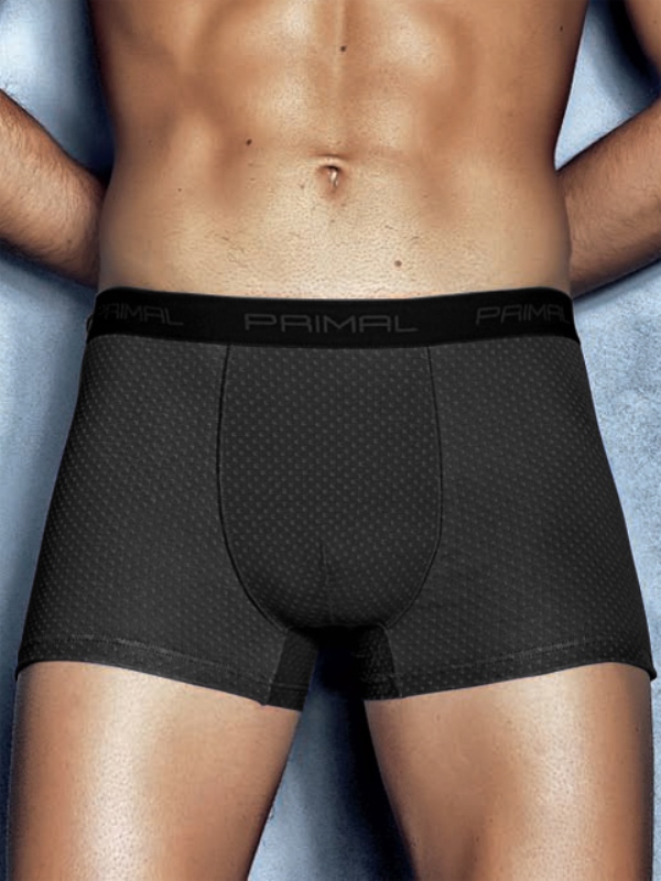Мужские трусы-боксеры из хлопка с эластаном, на поясе широкая резинка с круговой надписью "Primal", рисунок "уголки и горошек".
