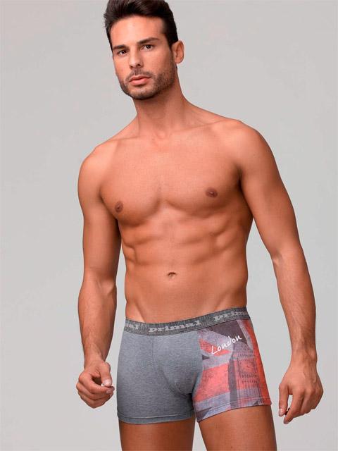 Мужские трусы-боксеры из хлопка с эластаном, на поясе широкая "джинсовая" резинка с надписью "Primal" по кругу, спереди цветной принт.