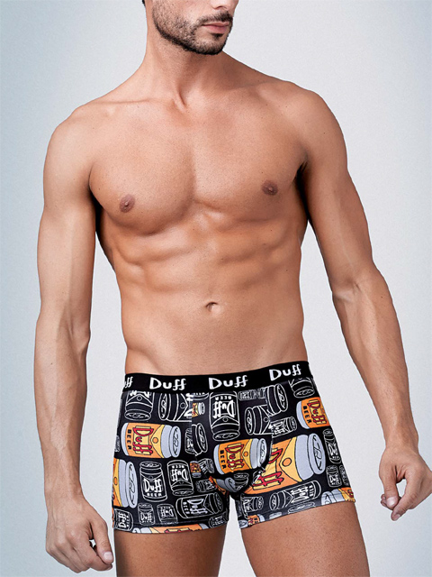 Мужские трусы-боксеры из хлопка с эластаном, яркий принт "алюминиевые банки", на поясе широкая резинка с надписью "Duff", сзади бесшовные.