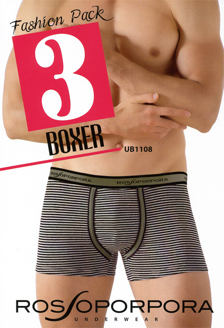 Мужские трусы-боксеры из хлопка с эластаном, на поясе широкая резинка с круговой надписью "Rossoporpora", ширинка выделена тесьмой, задняя часть бесшовная. В упаковке 3 штуки разного цвета: серые "в полоску", зеленые с боковым принтом "кеды" и черные с рисунком "боксерские перчатки".