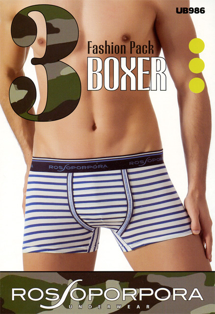 Мужские трусы-боксеры из хлопка с эластаном, на поясе широкая резинка с круговой надписью "Rossoporpora", ширинка выделена тесьмой, задняя часть бесшовная.