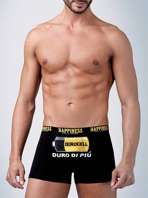 Мужские трусы-боксеры из хлопка с эластаном, на поясе широкая резинка с круговой надписью "Happiness", спереди крупный цветной принт "батарейка".