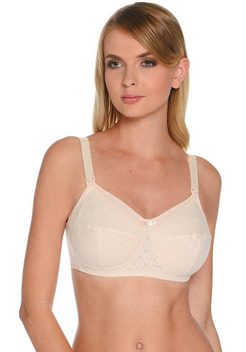 Бюстгальтер для кормящей матери из неэластичного и эластичного трикотажных хлопковых полотен, без каркасов. Чашки на подкладке из трикотажного хлопкового полотна, отстегивающиеся детали. Дополнительные корректирующие детали из двойного дублированного хлопкового полотна.