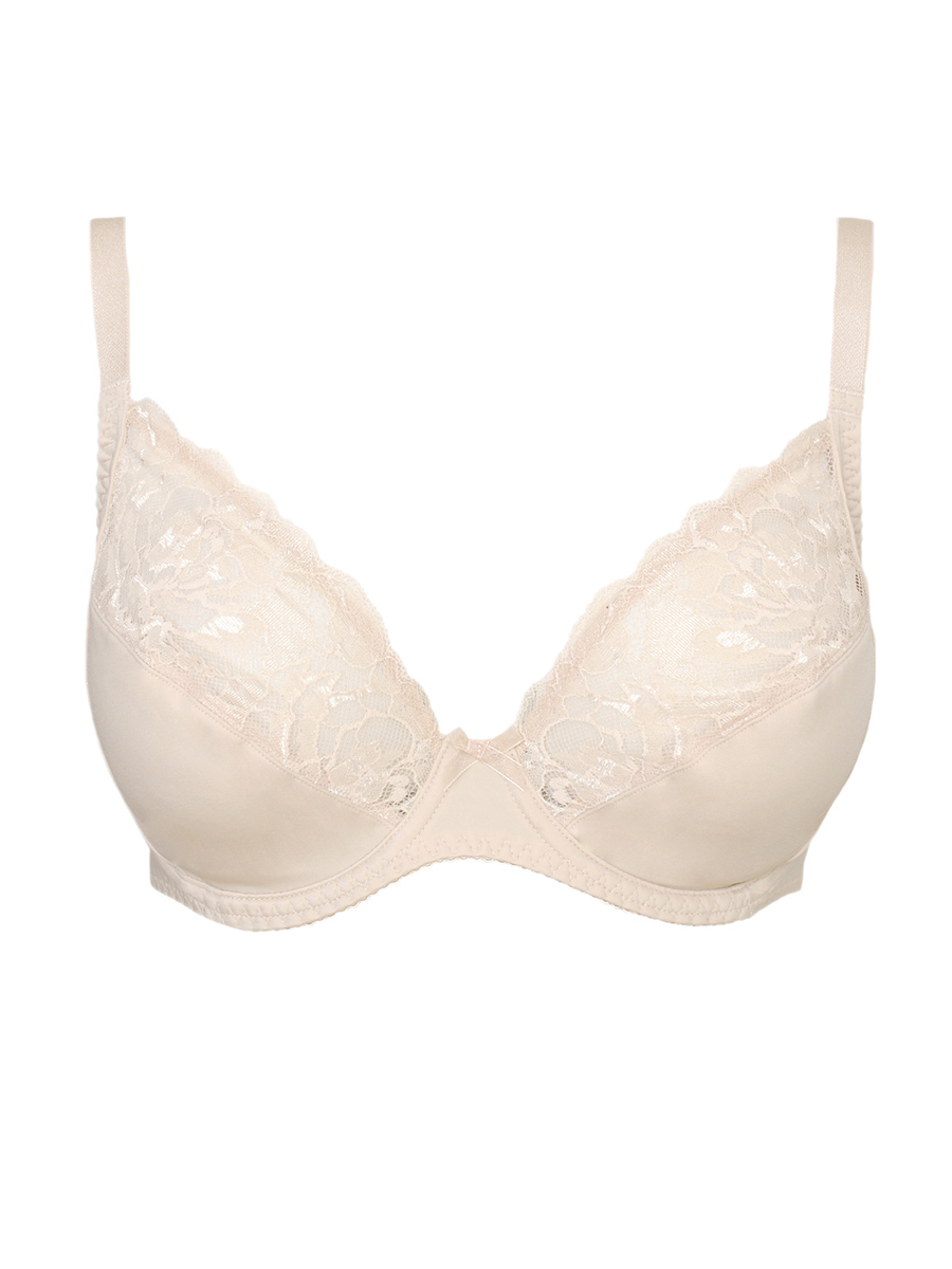 Бюстгальтер из эластичного трикотажного полотна и эластичного кружева, на каркасах. Мягкие чашки с двойным членением и боковой корректирующей деталью Нижние и боковые детали чашек на подкладке из эластичного сетчатого полотна.