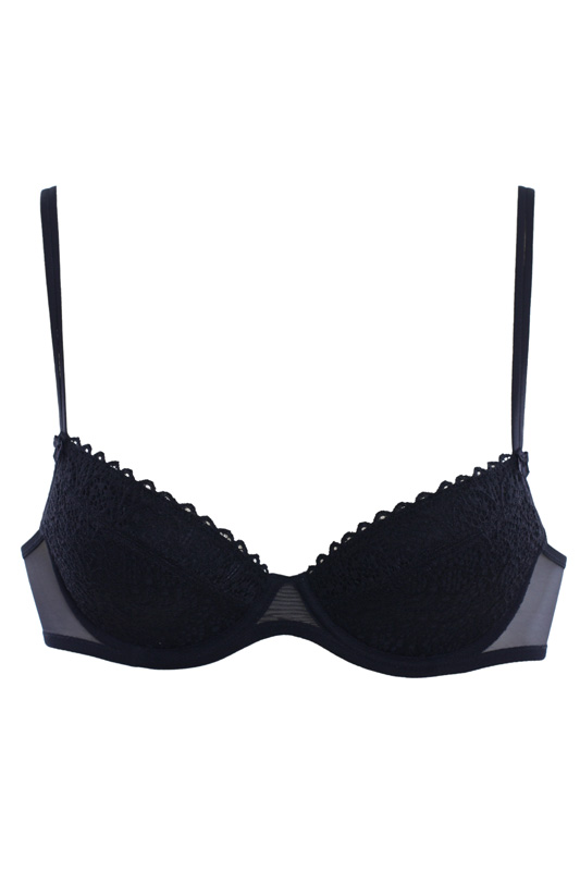 Бюстгальтер «пуш-ап» из эластичной сеточки и кружева на каркасах. Подкладка чашечек выполнена из ткани, содержащей хлопок. Объемные вкладыши помогут добавить привлекательности, создав дополнительный объем в области бюста.