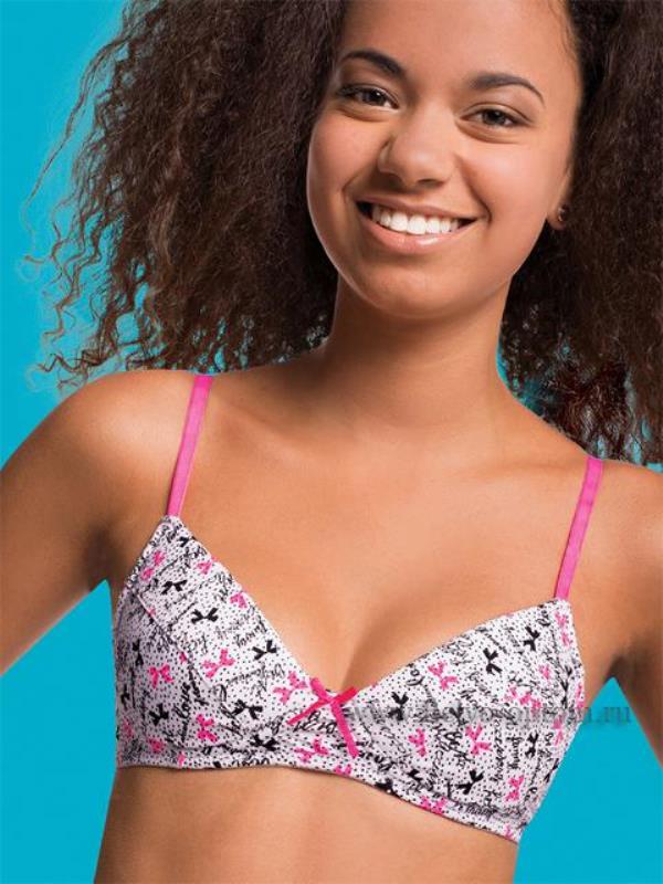 Качественный бюстгальтер для девушек, выполненный из мягкого хлопка с эластаном, с контрастными регулируемыми бретелями и поролоновыми чашечками, на соединителе маленький бантик, рисунок "точечки, надписи и бантики".