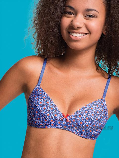 Качественный бюстгальтер для девушек, выполненный из мягкого хлопка с эластаном, с регулируемыми бретелями и поролоновыми чашечками, на соединителе маленький бантик, цветочный орнамент.