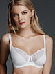 бюстгальтер из неэластичного трикотажного полотна, неэластичной вышивки и эластичного сетчатого полотна, на каркасах. Мягкие чашки с тройным диагональным членением. Маечный тип стана. Отделка — бантики.