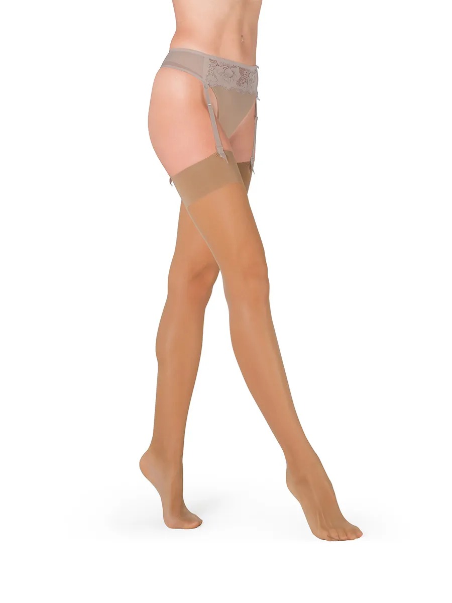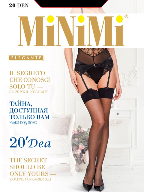 Тонкие эластичные чулки под пояс MINIMI Dea 20 с широкой гладкой каймой для крепления застежек пояса, с невидимым усиленным мыском. Формованная ступня.