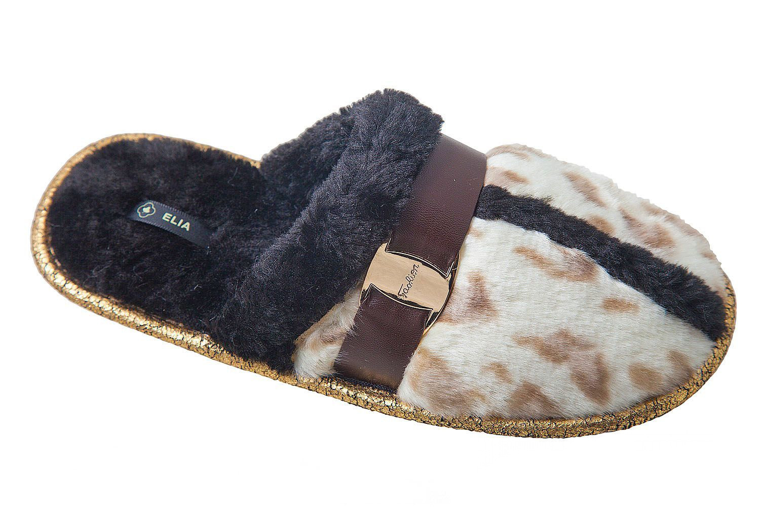 Стильные и комфортные тапочки на прорезиненной подошве, стилизованные под мех, с декоративным ремешком, прикрепленным пряжкой.