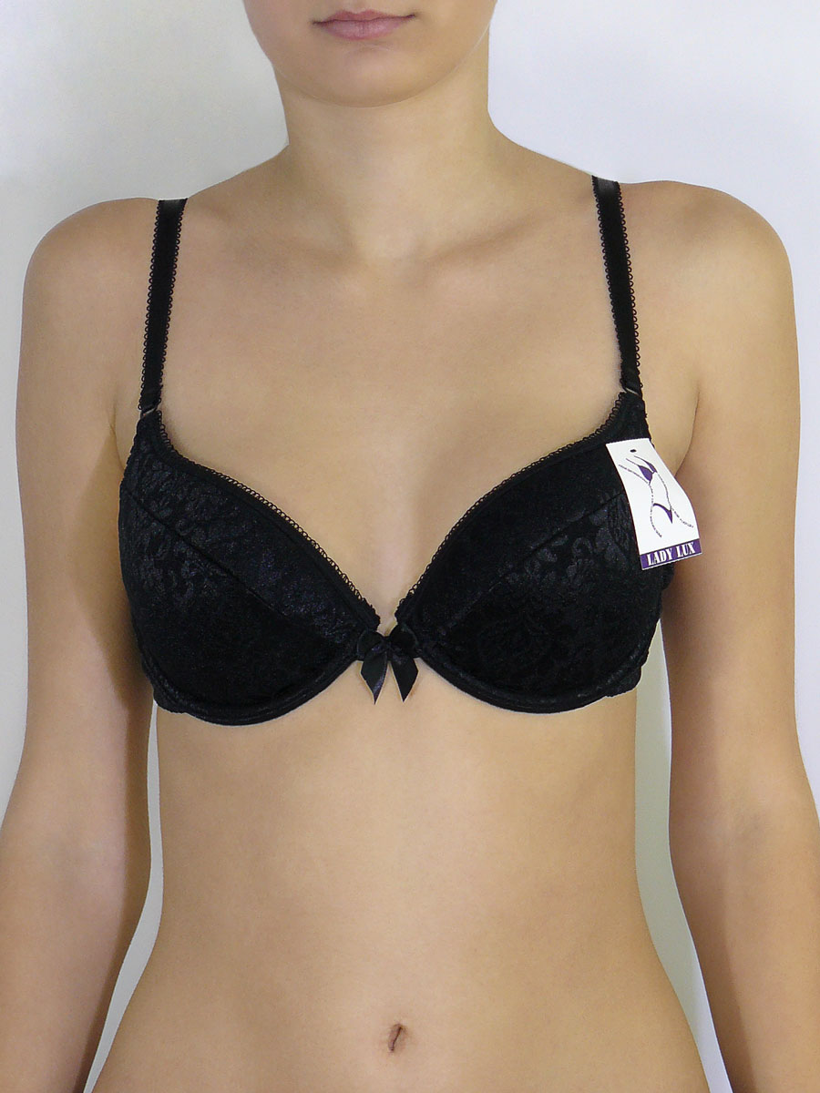 Бюстгальтер Push-up из эластичного жаккарда и поролона, на каркасах. Верх чашки отделан декоративной рюшкой. Поролоновая чашка с корректирующими подушечками. Съемные бретели+силиконовые бретели.
