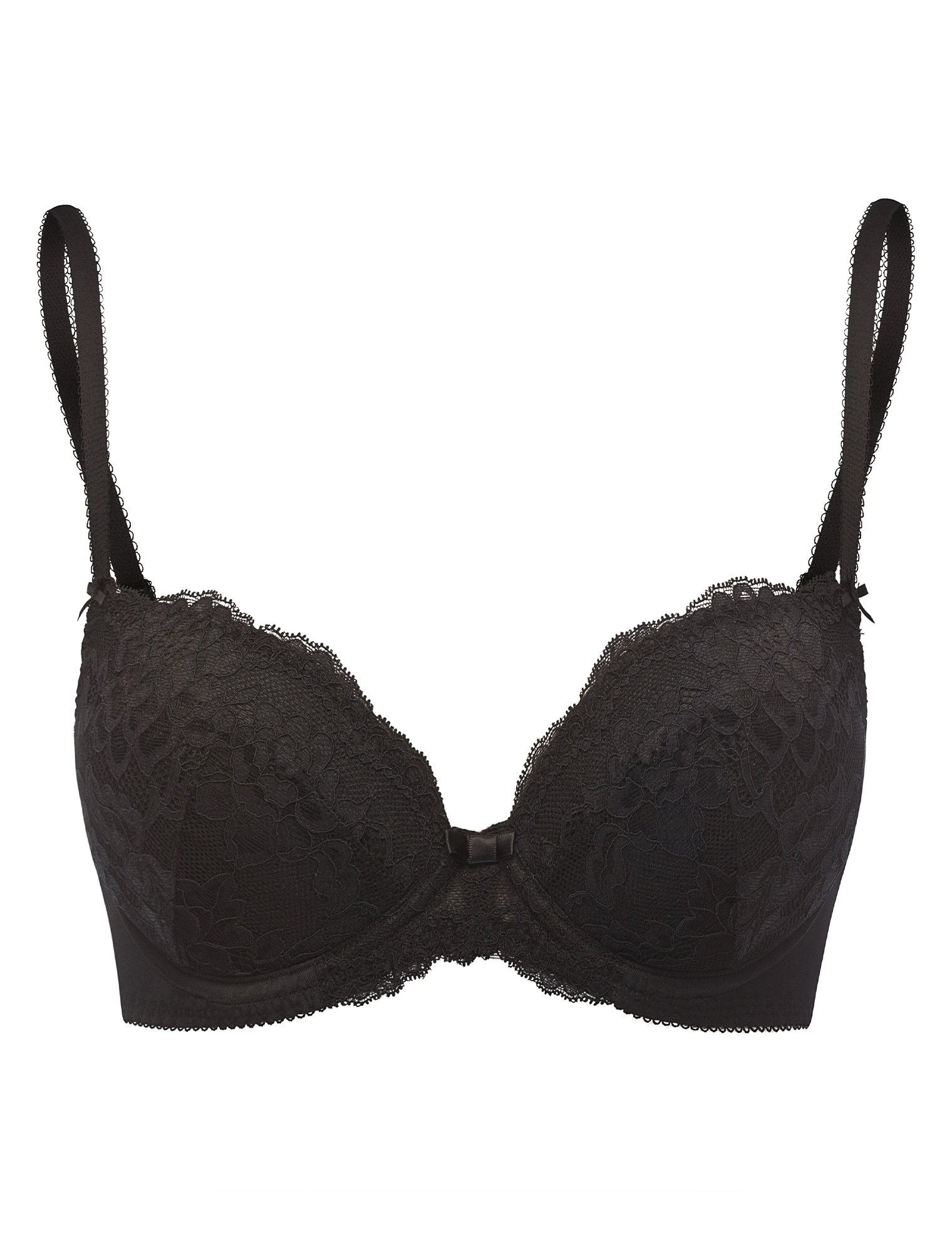 Бюстгальтер “пуш-ап” на каркасах. Чашки и центральная деталь бюстгальтера выполнены из эластичного кружева. В основе чашки конструкция из трех деталей. Внутренняя часть (подкладка) выполнена из хлопкового полотна, боковые детали их эластичного микроволокна. Съемные вкладыши пуш-ап. Бюстгальтер дополнен бантиком.