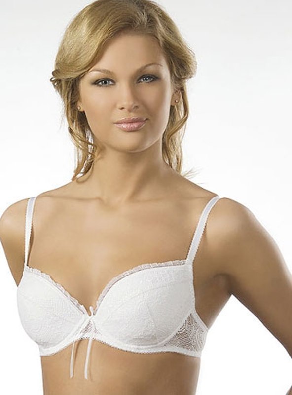 Бюстгальтер «пуш-ап» из нежного кружевного полотна, на каркасах. Чашечки на дубляже с хлопком, с объемными вкладышами для увеличения размера груди. Украшение - бантик, кружевные рюши.