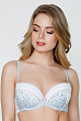 Бюстгальтер из принтованной атласной ткани, кружева и эластичной сетки, декорированный атласным бантиком по центру.Модель T-Shirt с формованной чашкой без Push-up для всех размеров.Бретели эластичные, съемные.