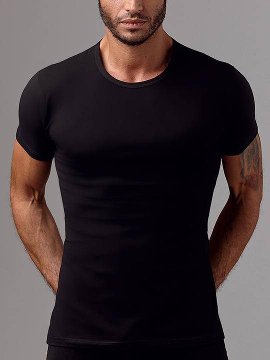 Футболка мужская облегающего кроя, с коротким рукавом и круглым вырезом горловины.