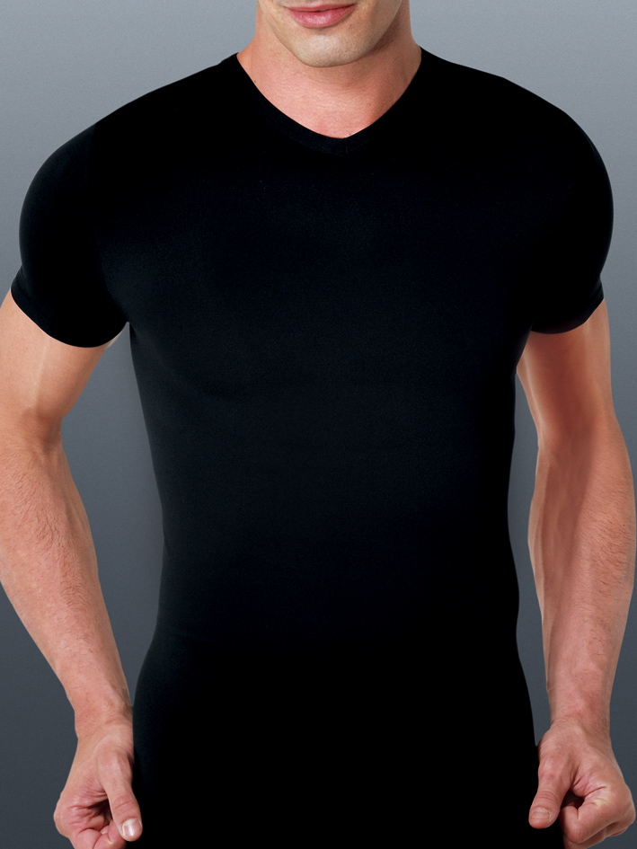 Мужская футболка из microfibra с V-образным вырезом и короткими рукавами. С бесшовной конструкцией (без боковых швов). Изделия из microfibra мягки и комфортны, очень практичны и просты в уходе, отлично сохраняют цвет (даже после многочисленных стирок), не требуют глажения, имеют хорошую формоустойчивость, гигиеничны, позволяют коже дышать, легко выводят влагу (пот) наружу не впитывая её.