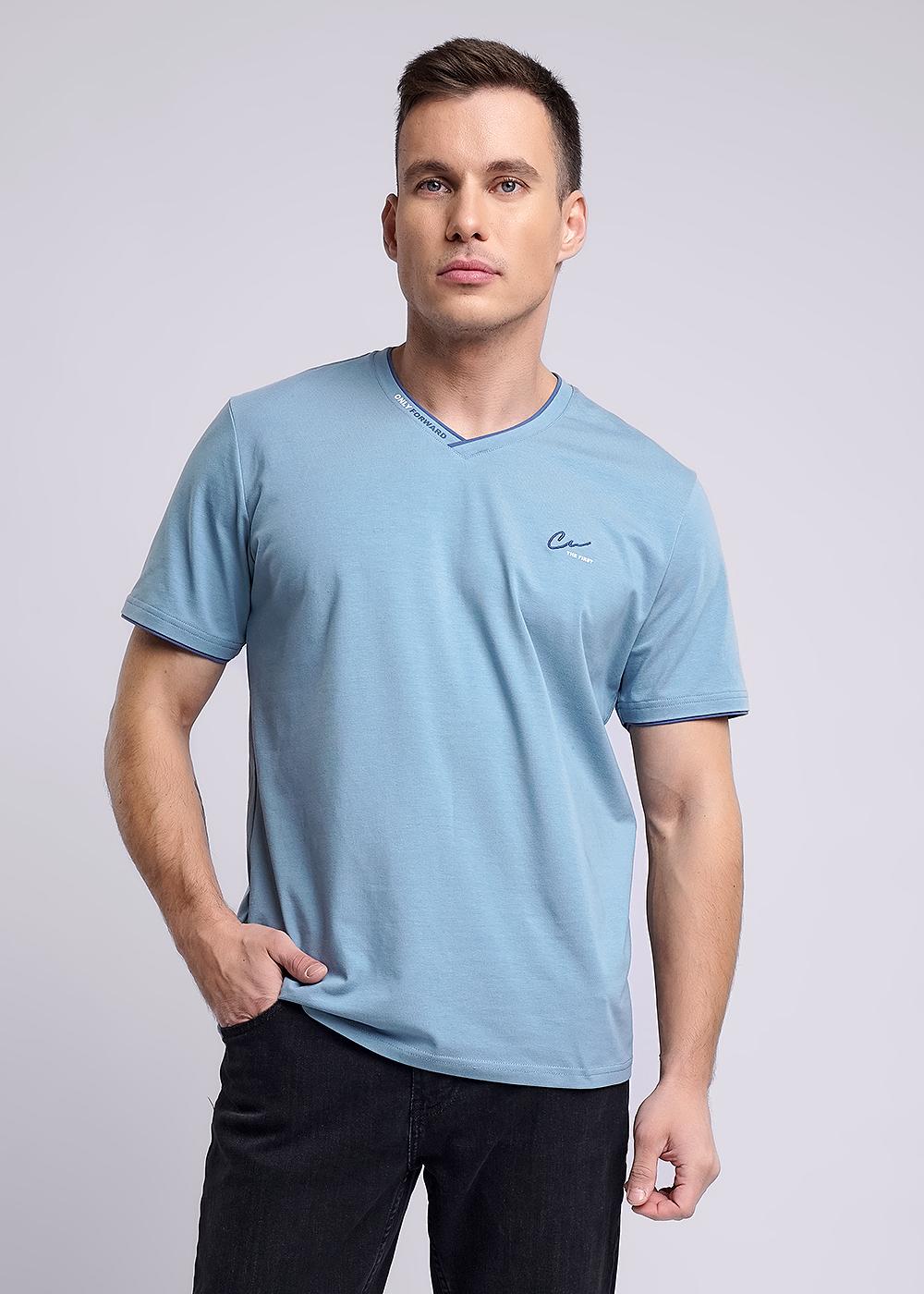 Мужская футболка из хлопкового трикотажного полотна. Изделие с V-образным вырезом горловины и коротким втачным рукавом. Футболка отличается за счет контрастных вставок по горловине и манжету, фирменной нашивке, а так же стильным.