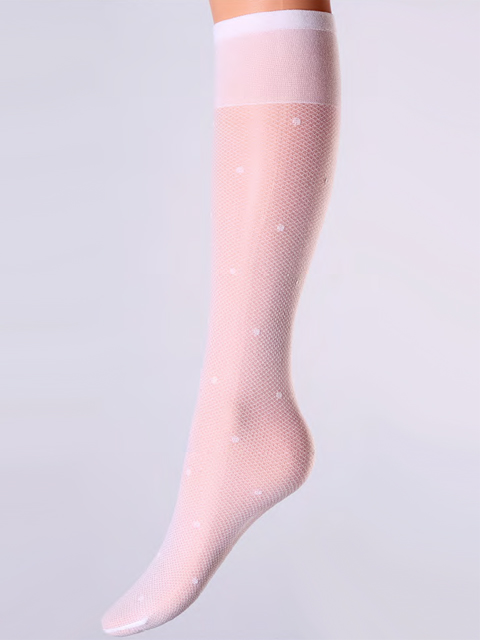 Полупрозрачные фантазийные гольфы с эффектом тюля и оплетенным эластаном, плотностью 40 ден, с комфортной резинкой, по всей длине тканый узор "мелкий горошек".