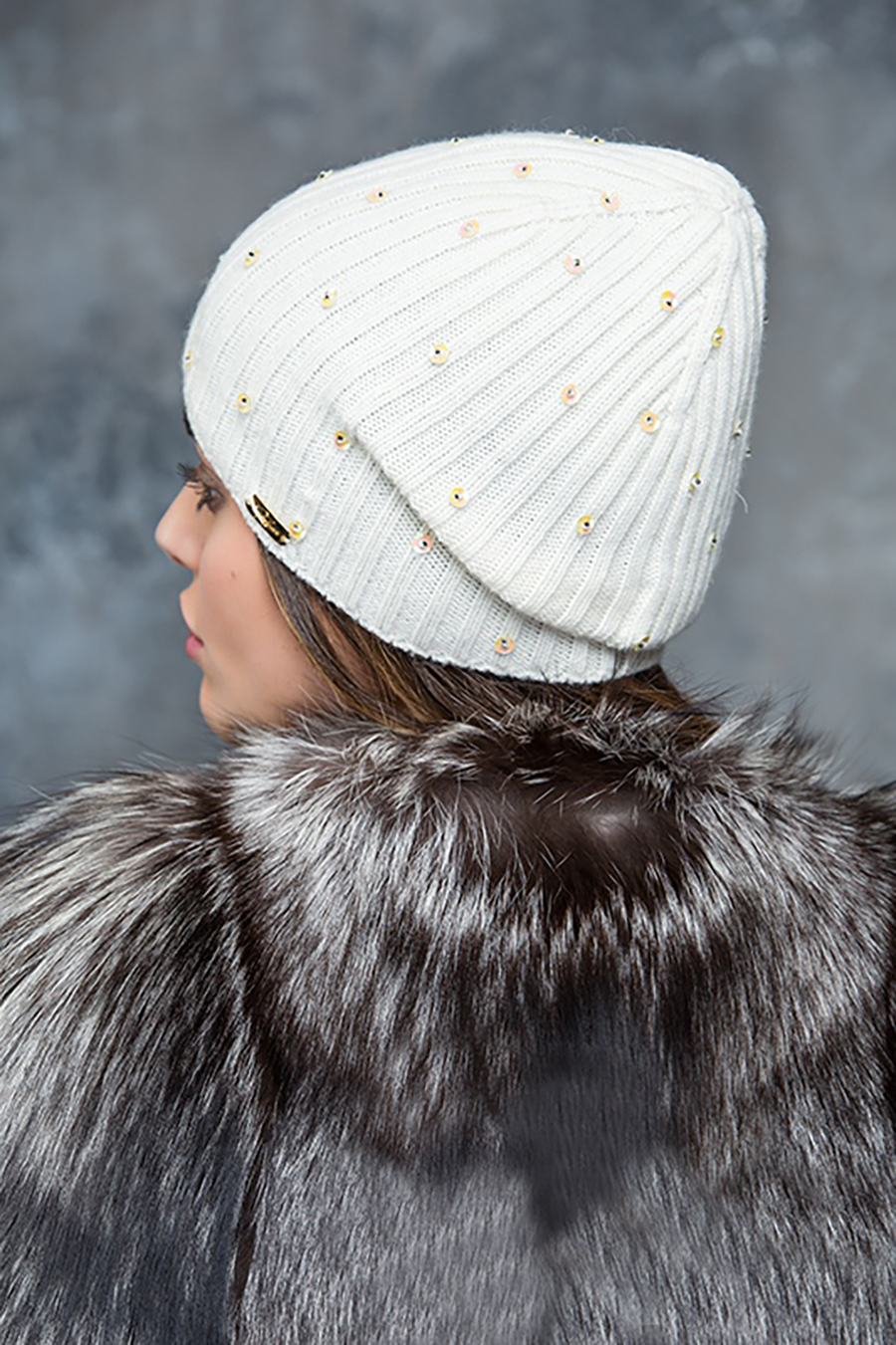 Удлиненный колпак одинарной вязки, декорированный вышивкой из бисера и пайеток.