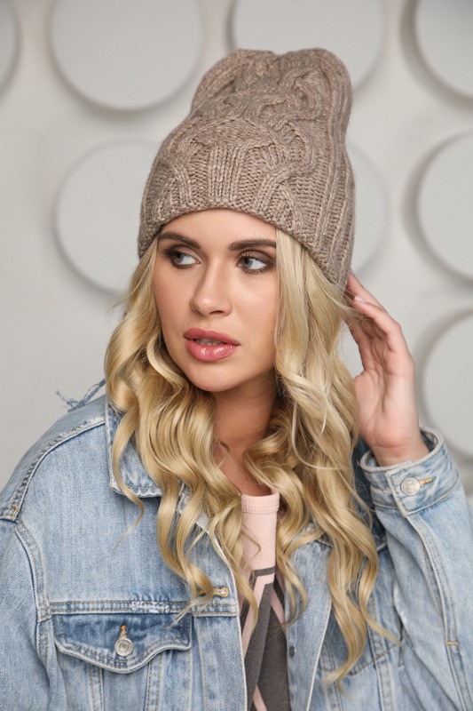 Шапка-колпак двойной вязки. Строгая геометрия линий и абстрактное переплетение аранов дополняют друг друга и придают модели оригинальности.