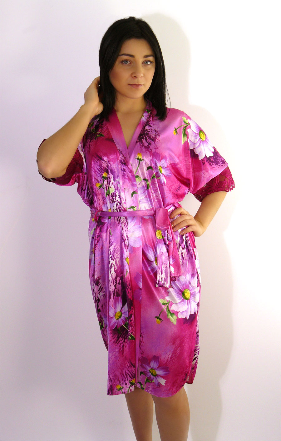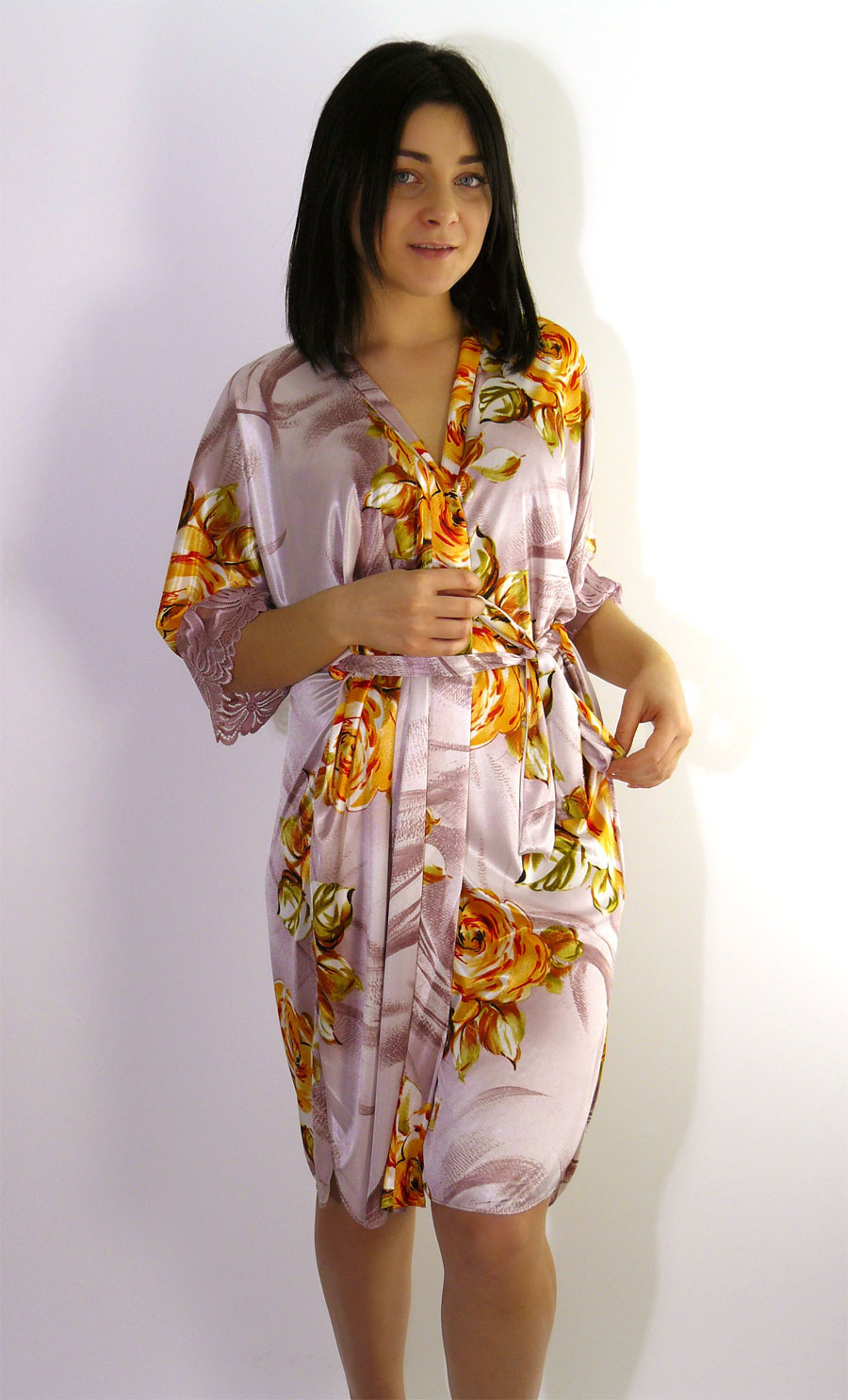 Короткий халатик из шелковистого трикотажного однотонного полотна; прямого силуэта, свободного покроя, с запахом под пояс. Цельнокроенный короткий рукав по низу отделан эластичным кружевом в тон. По бокам закруглённые разрезы.