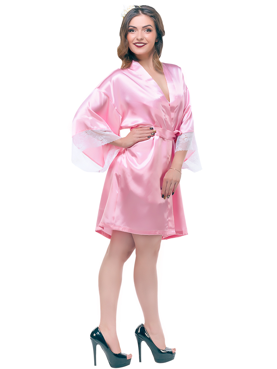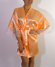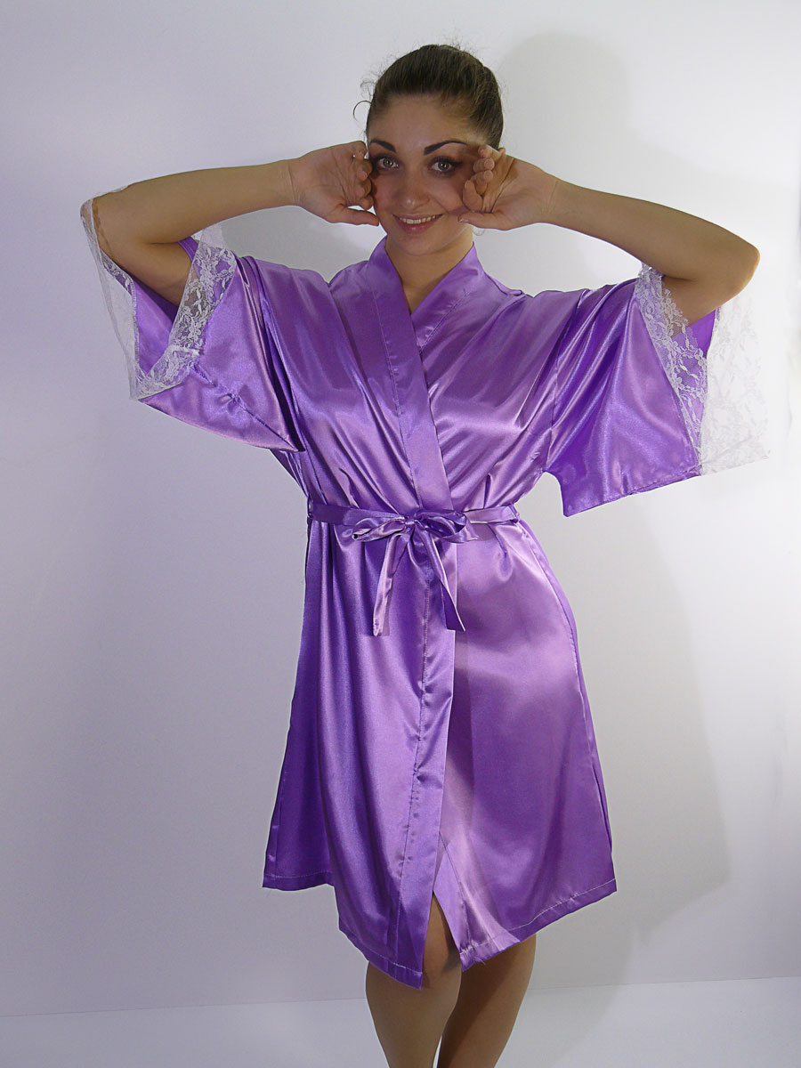 Короткий кокетливый халатик покроя "кимоно" из однотонного искусственного шелка, с запахом под пояс. Рукава широкие, длиной три четверти, с удлинённой проймой, по низу отделаны изысканным ажурным кружевом с фестонами. На спинке выполнена декоративная вставка в форме сердечка из ажурного кружева.