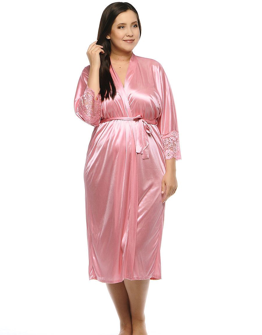 Длинный трикотажный халат из тонкого, атласного, слегка эластичного полотна с поясом. Рукава халата украшены кружевом.