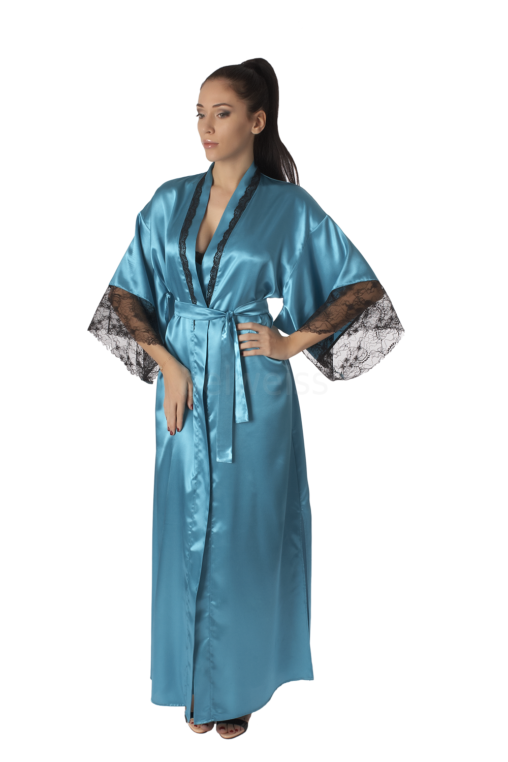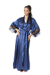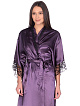Роскошный длинный халат из искусственного однотонного шелка, прямого силуэта, с запахом под пояс. Рукава широкие, длиной три четверти, с удлинённой проймой, по низу отделаны изысканным ажурным кружевом с фестонами. Спинка со сборкой по талии с притачным поясом. По бокам высокие разрезы. Линия горловины декорирована узким кружевом.