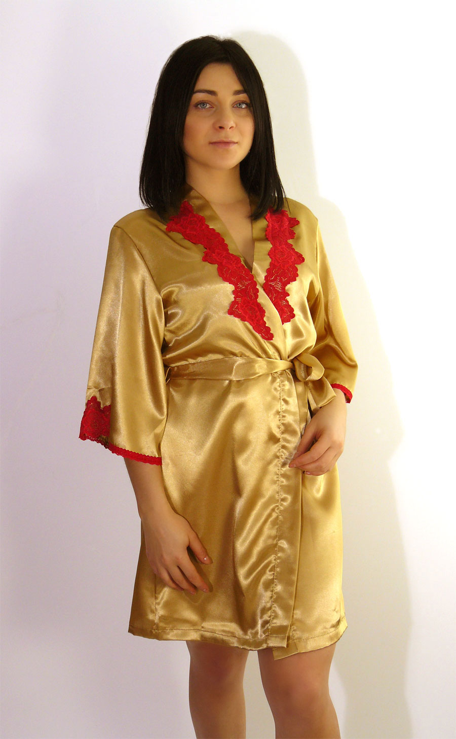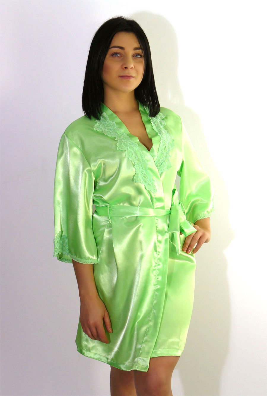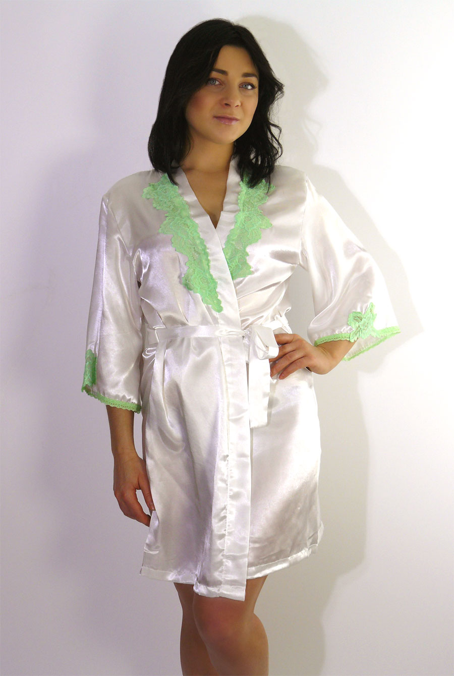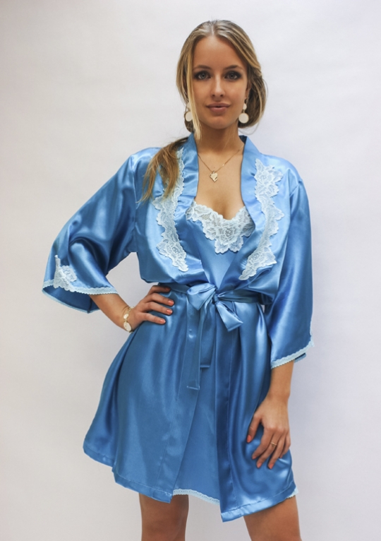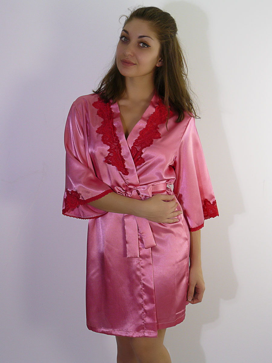 Короткий халат на запах, декорирован кружевом.
