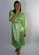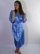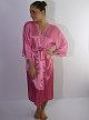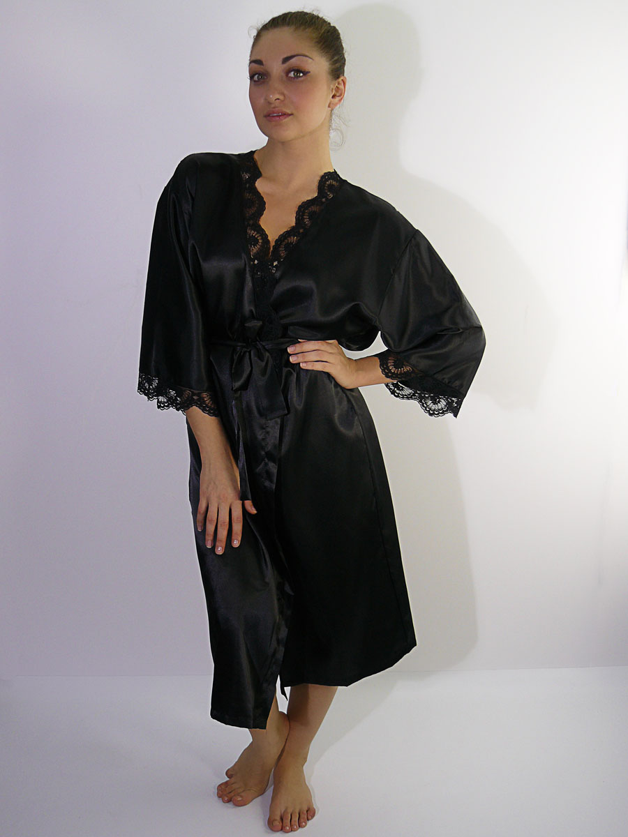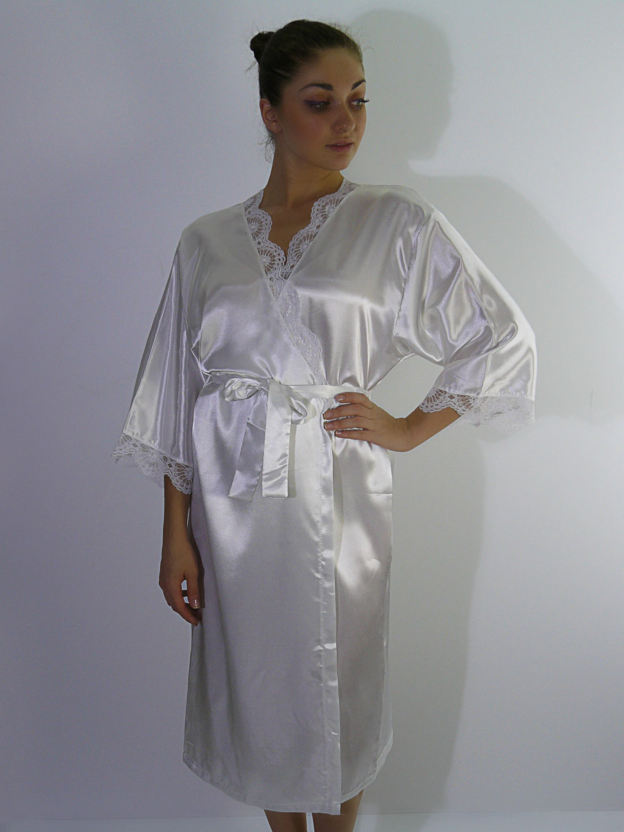 Халат средней длины на запах, с рукавом три четверти. Декорирован кружевом.
