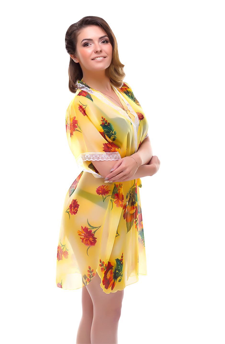 Легкий шифоновый халатик покроя "кимоно", с запахом под пояс, с планкой по борту. Короткий рукав и горловина украшены кружевом.