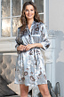 Короткий халат Mia-Amore с запахом, с рукавами длиной 3/4 выполнен из принтованного искусственного шелка. Планка халата отделана тонким кантом. По низу рукава оформлены ажурным кружевом. В боковых швах – карманы.