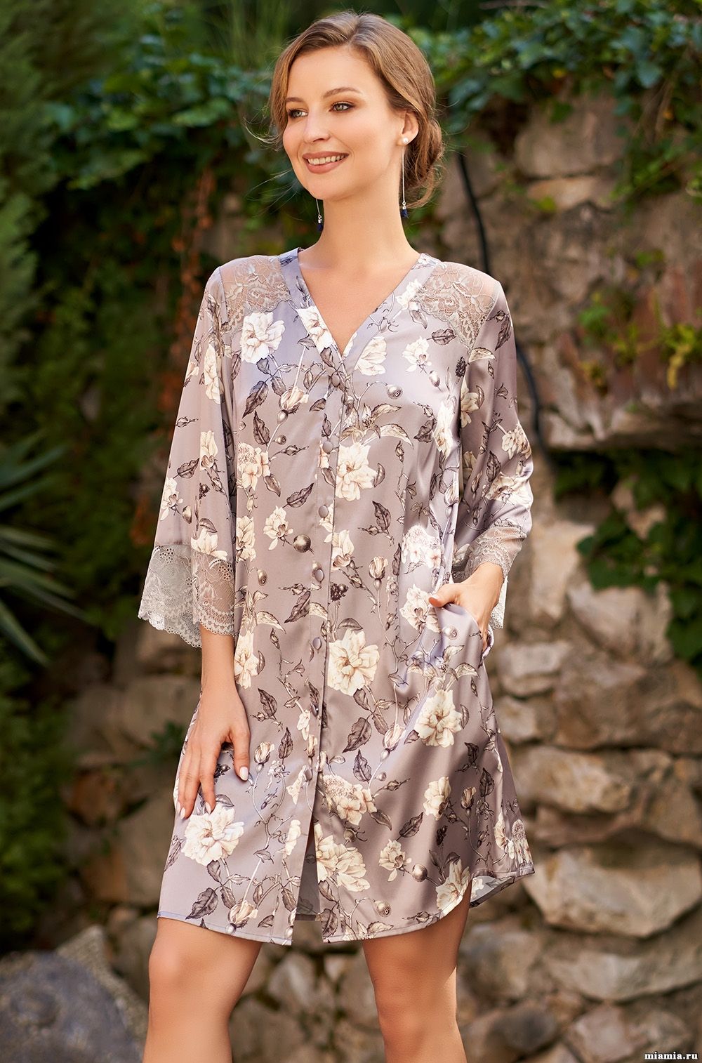 Короткая рубашка Mia-Amore с центральной застежкой на пуговицы и V-образным вырезом, с рукавом ¾, выполнена из принтованного смесового шелка. Низ рукавов элегантно украшен широкой полосой кружева. На плечах полочки и спинке изящные кружевные вставки, По бокам обработаны карманы.