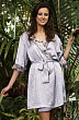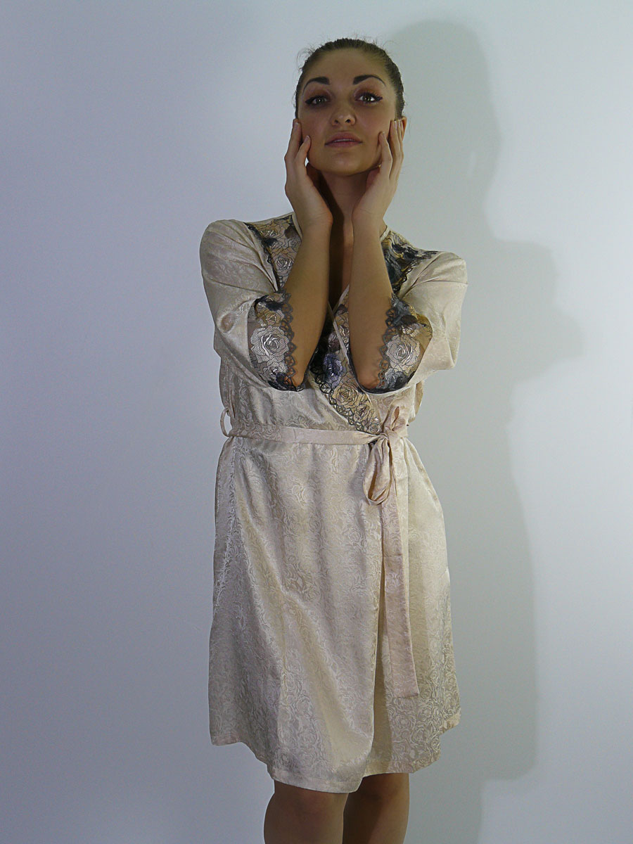 Классический короткий халат Mia-Mia выполнен из однотонного натурального шелка с жаккардовой основой, декорирован широким многоцветным кружевом.