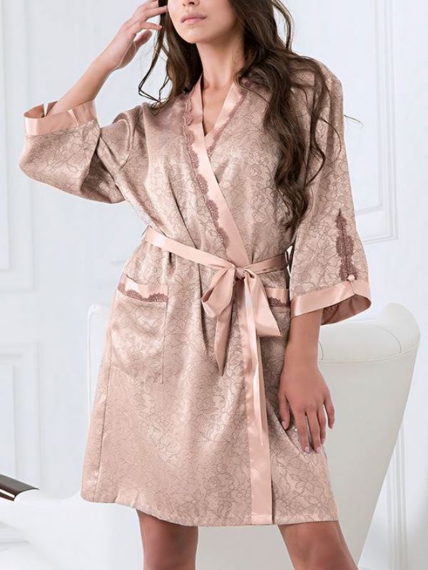Классический короткий халат – кимоно с накладными карманами, выполнен из жаккардового искусственного шелка. В качестве отделки используется ажурное кружево и однотонный атлас.