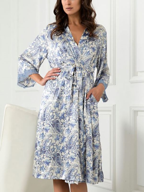 Длинный халат из смесового шелкового полотна с нежным голубым рисунком, рукава халата по низу декорированы ажурным вышивным кружевом.