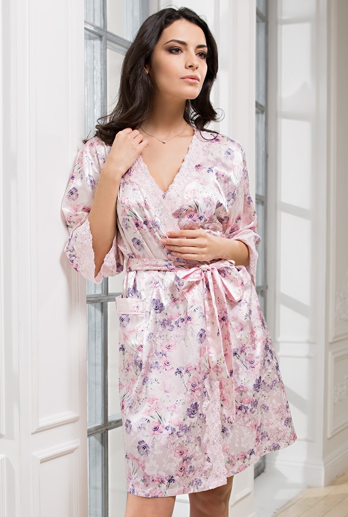 Короткий халат-кимоно Mia-Sofia выполнен из искусственного принтованного жаккардового шелка. Кружево расположено по верхней части бортов и низу рукавов.