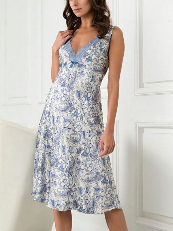Длинная сорочка из смесового шелкового полотна с нежным голубым рисунком, горловина отделана ажурным вышивным кружевом.