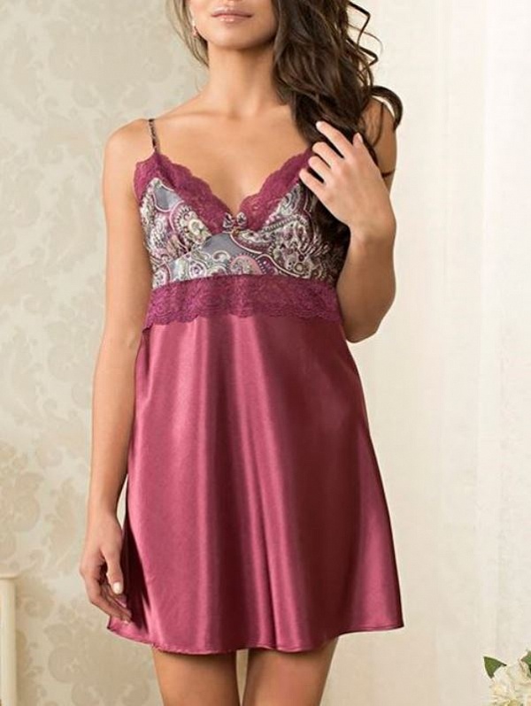 Короткая сорочка приталенного силуэта на тонких бретелях. Верхняя часть сорочки выполнена из принтованного атласа, а нижняя из однотонного. Кружево расположено по верху сорочки, а также по границе соединения двух видов ткани. Атласный бантик с подвеской украшает вырез.