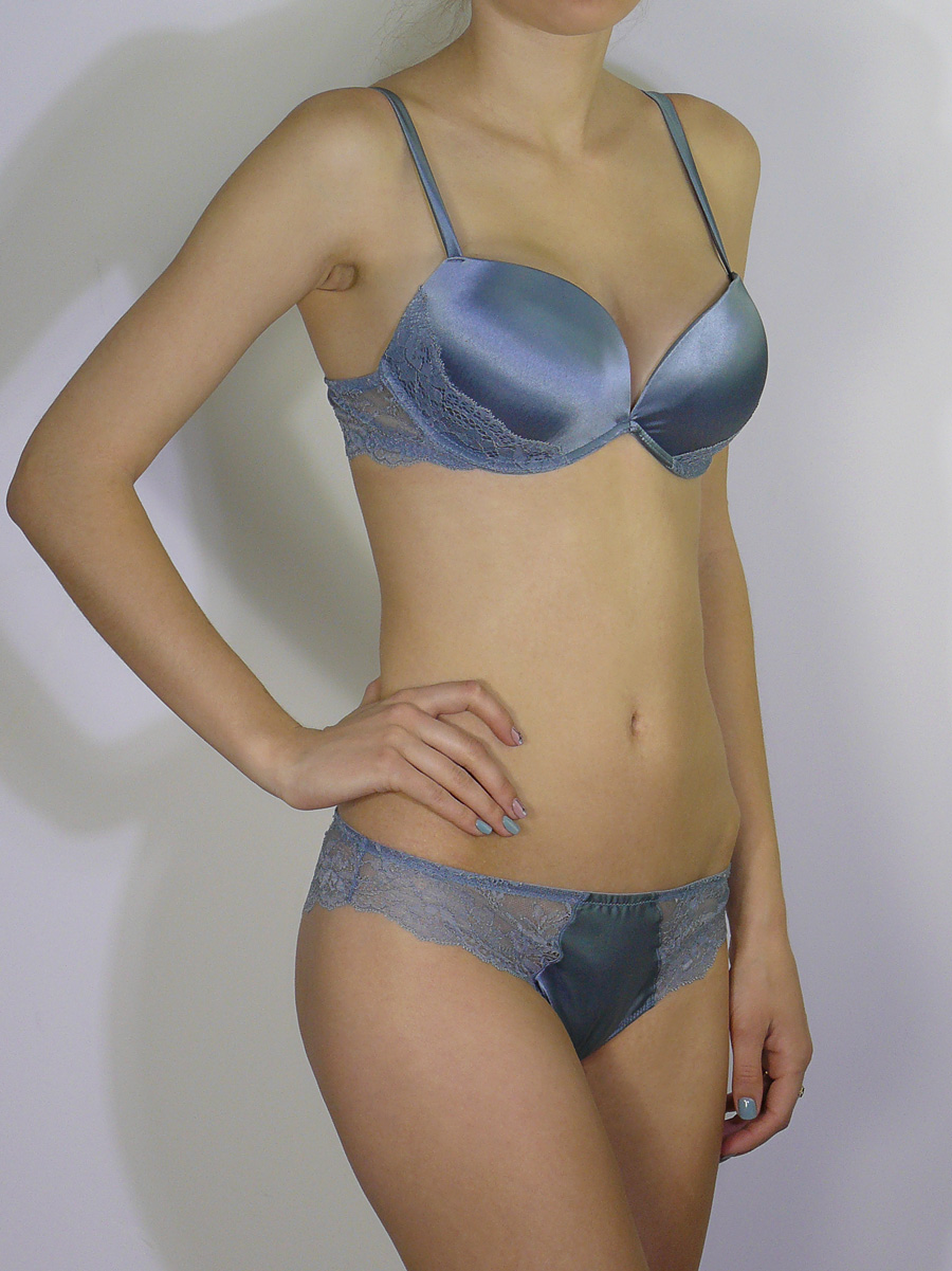 Комплект: бюстгальтер "супер пуш-ап" с гелевой чашкой и трусики-бразильяна, выполнен из сатина и кружева. Бюстгальтер зрительно придает +2 размера груди. Коллекция "Avida".