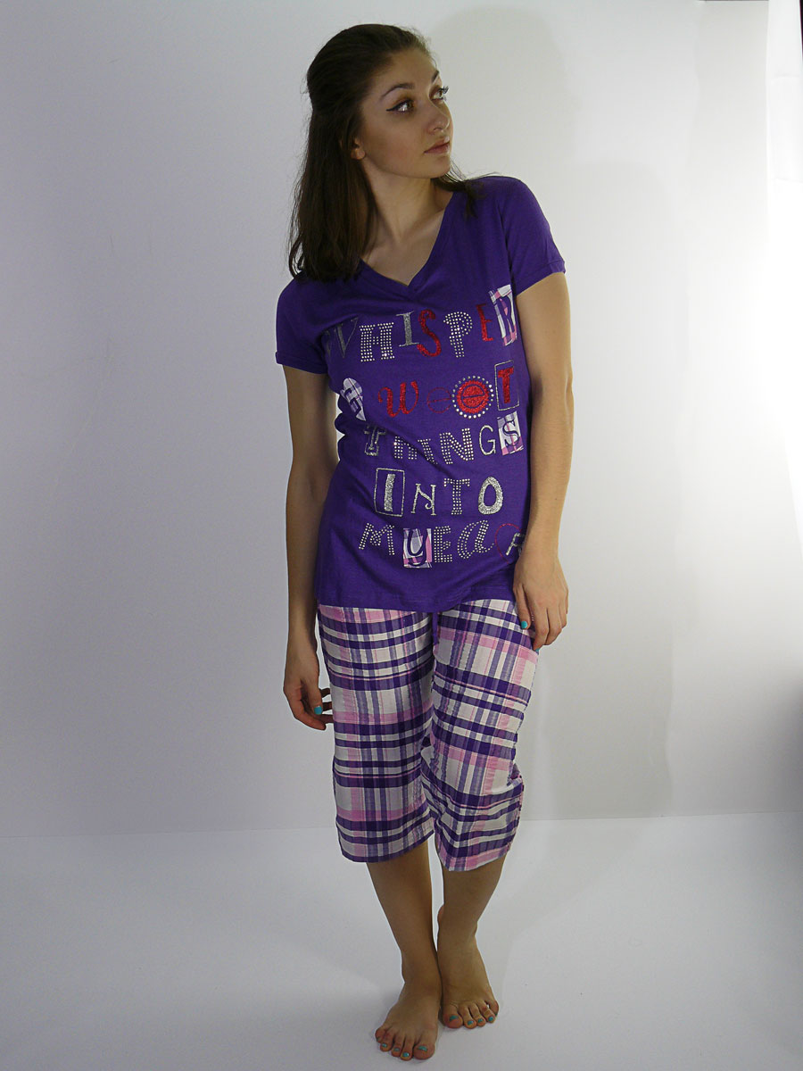 Женский комплект: футболка с коротким рвукавом и бриджи в клетку.