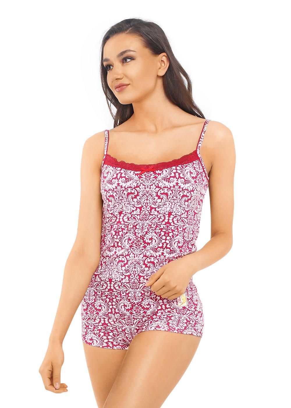 Комплект набивной ,состоящий из майки на узкой бретели с кружевом и мини-шорт