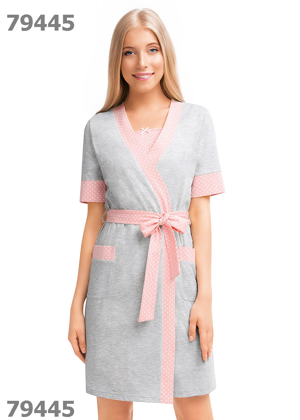 Комплект женский из халата и сорочки среднего объема, длиной выше колена. Халат однотонный на запах, с принтом и декоративными деталями из набивного полотна. Сорочка из набивной кулирки на узких бретелях с бантиком по переду.