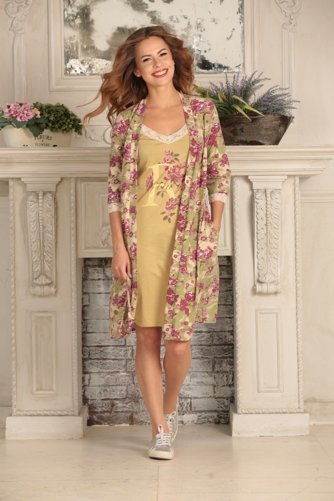 Комплект халат+ночная сорочка из мягкой трикотажной ткани. Модель сочетает в себе безупречный крой, интересный принт, модную цветовую гамму и отличное качество. Нанесенные принты (рисунки) выполнены из высококачественных красителей на водной основе, что позволяет утюжить наши изделия по лицевой стороне.