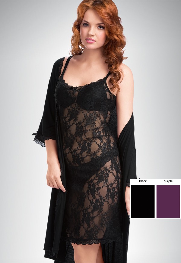 Комплект сорочка + халат Pelican PADG 209. Эффектная полупрозрачная сорочка подчеркнет изгибы вашего тела. Модель с ажарными элементами на тонких бретельках. Легкий халатик выполнен из мягкого модала, для удобства имеется пояс, контуры отделаны ажурными деталями.