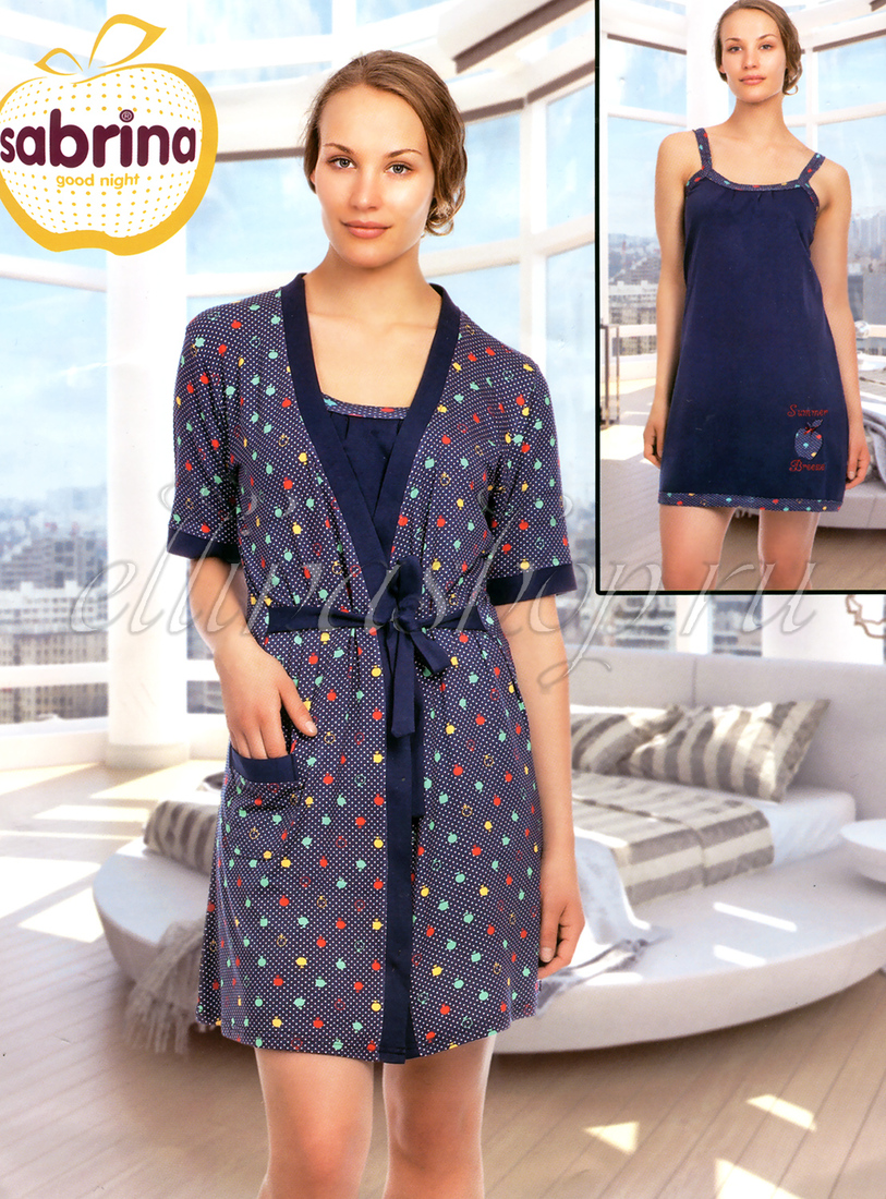 Трикотажный женский халат средней длины. Халат на запахе и съемном поясе, так же имеются дополнительные завязки для наилучшей фиксацией на теле. Сбоку на халате накладной карман. Дизайн ткани в мелкий белых горошек с разноцветными цветными яблочками.Сорочка средней длины, слегка расширенная к низу. Лямки средней ширины, не регулируемые. Основная ткань модели спереди и со спины - однотонного синего тона + декоративные вставки в тон халата по низу сорочки, вырезу горловины и лямкам. Спереди сбоку по низу сорочки декоративная тканевая аппликация в виде яблочка.