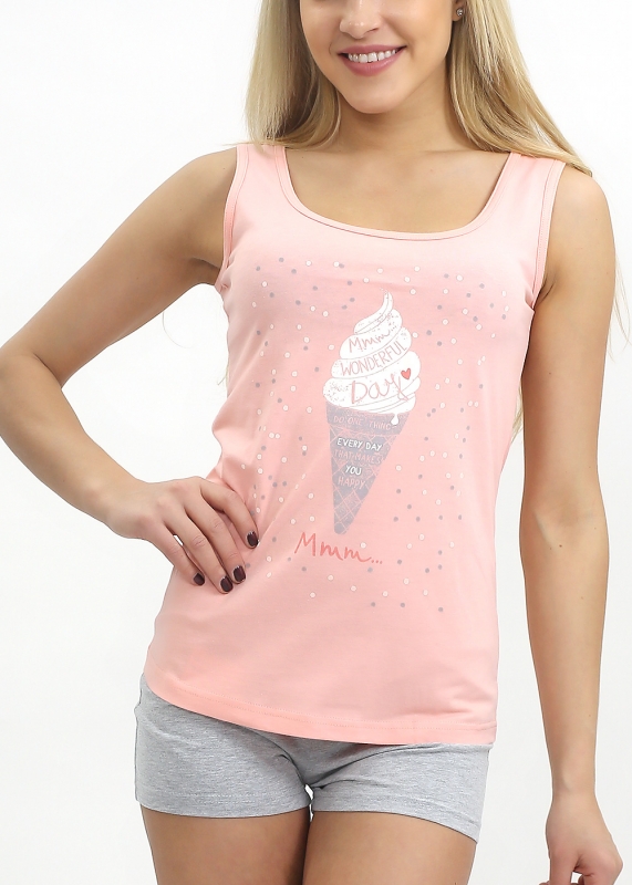 Комплект для дома, состоящий из однотонной майки и шорт, майка декорирована принтом.
