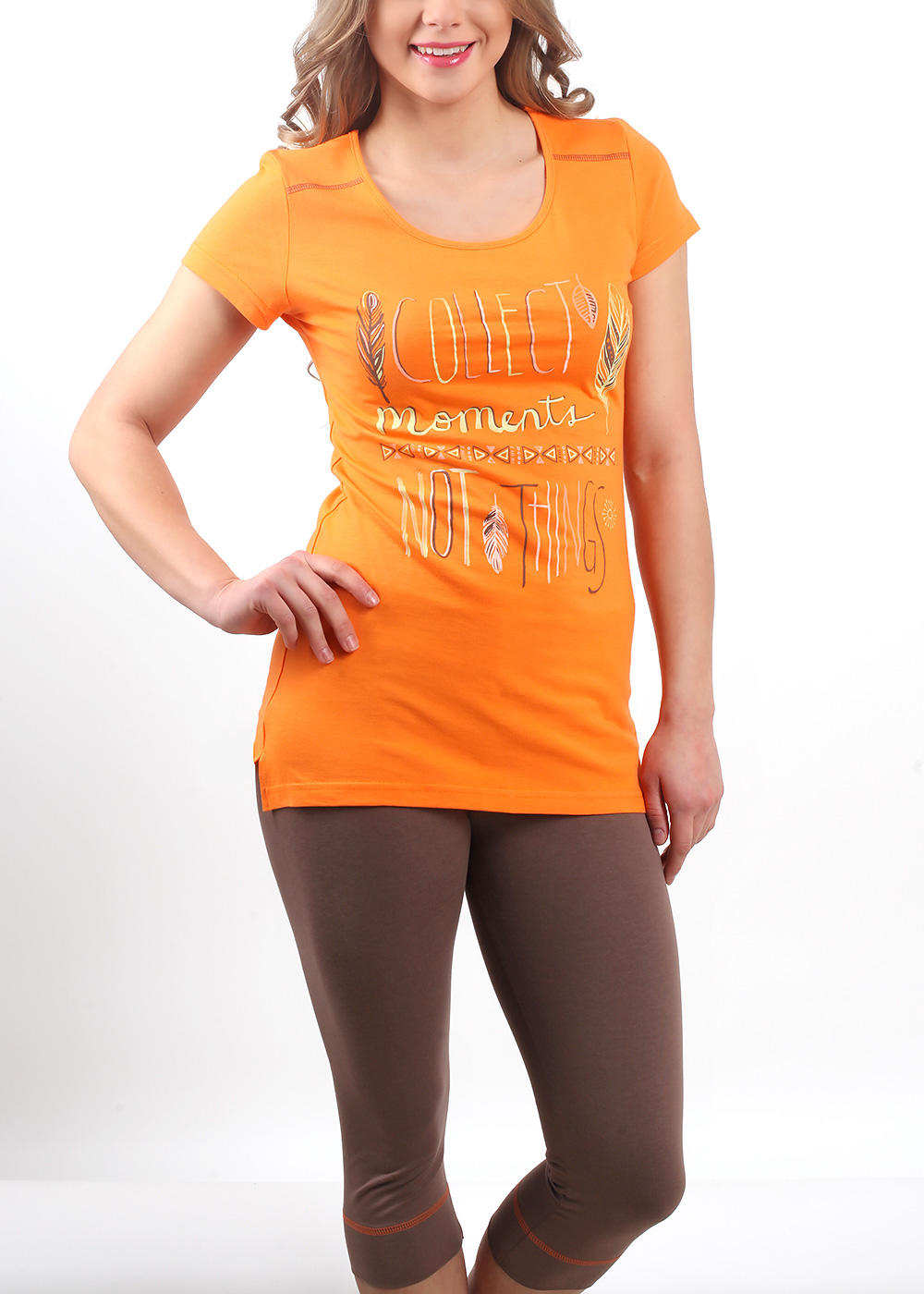 Комплект для дома, состоящий из футболки с коротким рукавом и леггинсов. Футболка декорирована оригинальным принтом.